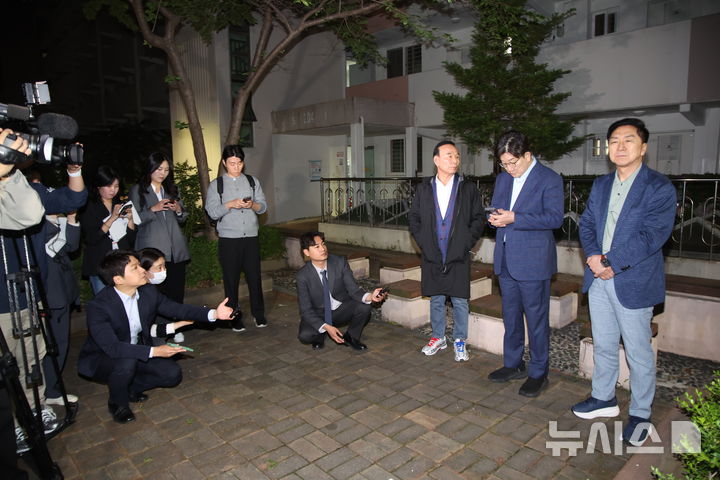 [서울=뉴시스] 김금보 기자 = 권성동 국민의힘 원내대표를 비롯한 중진 의원들이 6일 오후 서울 관악구 김문수 대선후보의 자택 앞에서 '한덕수 후보와의 단일화' 관련 논의를 위해 김 후보를 기다리고 있다. 왼쪽부터 박덕흠 의원, 권 원내대표, 김기현 의원. 2025.05.06. [email protected]