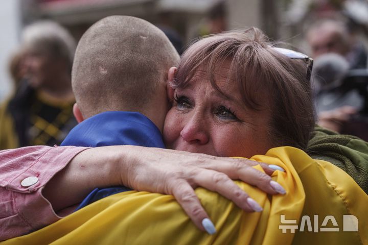 [우크라이나=AP/뉴시스] 6일(현지 시간) 러시아와의 포로 교환을 통해 석방된 우크라이나 군인이 장소가 알려지지 않은 곳에 도착해 가족과 재회하고 있다. 양국은 이날 205명의 포로를 교환했다. 2025.05.07.