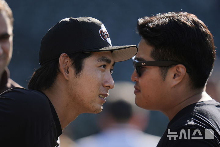 [시카고=AP/뉴시스] 샌프란시스코 자이언츠의 이정후(왼쪽)가 6일(현지 시간) 미 일리노이주 시카고의 리글리 필드에서 열리는 2025 메이저리그 시카고 컵스와의 경기 전 동료와 얘기를 나누고 있다. 2025.05.07.