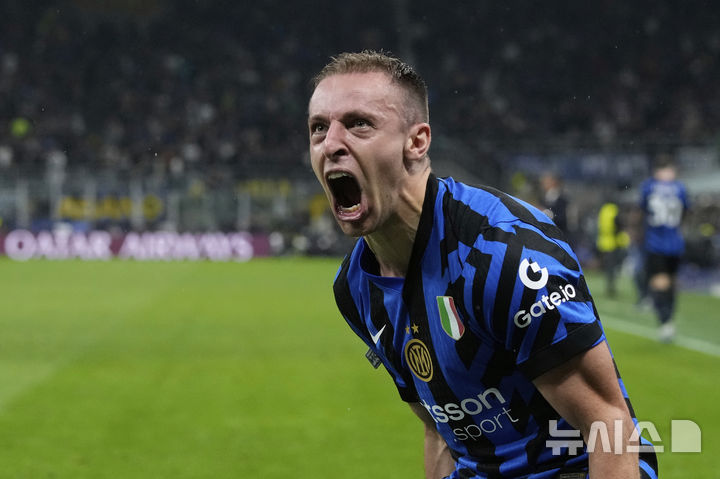 [밀라노=AP/뉴시스] 인테르 밀란의 다비데 프라테시가 6일(현지 시간) 이탈리아 밀라노 산 시로 스타디움에서 열린 2024-25 유럽축구연맹(UEFA) 챔피언스리그(UCL) 4강 2차전 FC 바르셀로나(스페인)와 경기 연장 전반 9분 역전 골을 넣은 후 포효하고 있다. 인테르가 4-3으로 이겨 1,2차전 합계 7-6으로 승리하면서 UCL 결승에 올랐다. 2025.05.07.