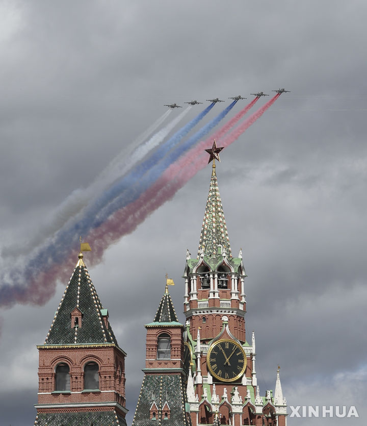 [모스크바=신화/뉴시스] 6일(현지 시간) 러시아 모스크바 붉은광장에서 제80주년 2차 세계대전 승리 기념 '전승절' 열병식 예행연습 중인 곡예비행단이 러시아 국기 색깔의 연막을 뿌리며 편대 비행하고 있다. 2025.05.07.