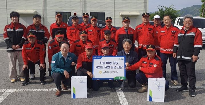 [옥천=뉴시스] 농협 충북 옥천군지부 임직원들이 7일 옥천군청에서 산불전문예방 진화대원과 산불감시원들에게 활동물품을 전달하고 있다. 이경래(앞줄 오른쪽 두번째) 지부장과 황규철(앞줄 왼쪽 첫번째) 옥천군수가 대원들을 격려한 후 물품 전달식을 하고 있다. (사진=농협 옥천군지부) 2025.05.07. photo.newsis.com