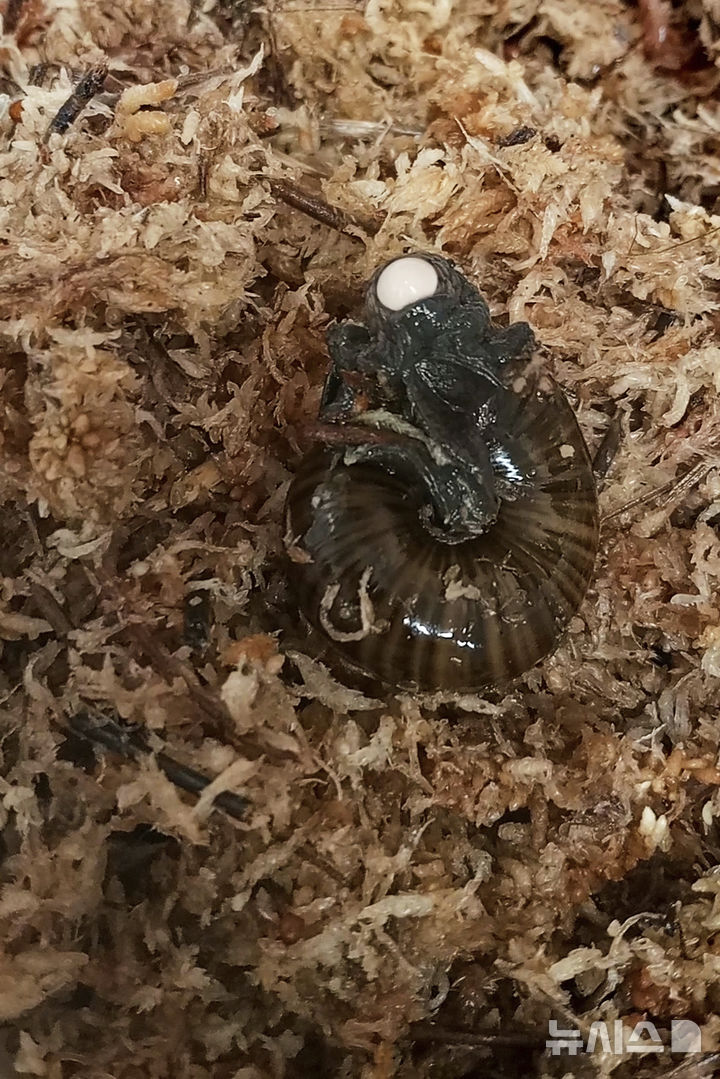 [호키티카=AP/뉴시스] 뉴질랜드 자연보존국(DOC)은 뉴질랜드에만 서식하며 멸종 위기에 처한 달팽이 '포웰리판타 아우구스타'의 희귀 번식 장면을 처음으로 촬영했다고 7일(현지 시간) 밝혔다. 사진은 2024년 9월 18일 뉴질랜드 호키티카의 '호키티카 달팽이 보호 시설'에서 해당 달팽이가 목 아래쪽 생식구를 통해 알을 낳는 모습. 2025.05.07.