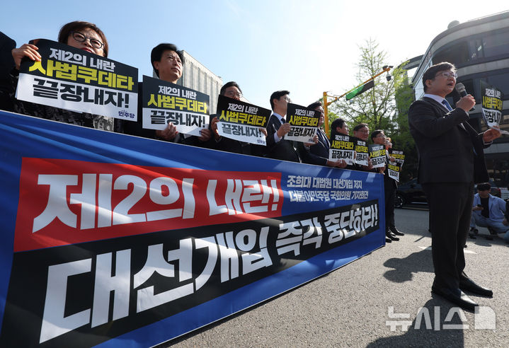 [서울=뉴시스] 조수정 기자 = 더불어민주당 국회의원 비상행동 소속 김남근 의원이 7일 서울 서초구 서울고등법원 앞에서 열린 이재명 더불어민주당 대선 후보의 공직선거법 위반 사건에 대한 대법원의 유죄 취지 파기환송과 관련, 규탄 및 대선 개입 저지 기자회견에서 발언하고 있다. 2025.05.07. [email protected]