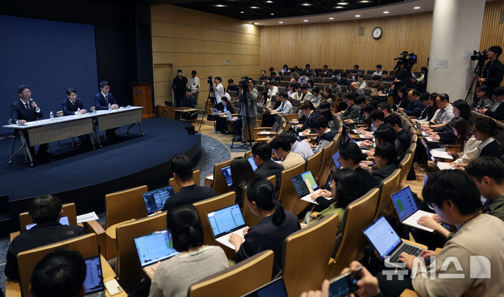 [서울=뉴시스] 이영환 기자 = 류정환(왼쪽부터) SKT 네트워크 인프라 센터장, 임봉호 SKT MNO 사업부장, 김희섭 SKT 커뮤니케이션 센터장이 7일 오전 서울 중구 SK텔레콤 T타워 SUPEX홀에서 SK텔레콤의 해킹 사고와 관련해 취재진 질문에 답하고 있다. (공동취재) 2025.05.07. [email protected]