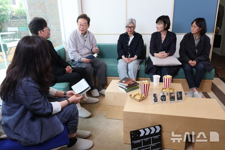 [전주=뉴시스] 조성봉 기자 = 이재명 더불어민주당 대통령 후보가 2차 골목골목 경청투어 마지막 날인 7일 오후 전북 전주시의 카페에서 '영화와 드라마, 정치가 그리는 미래의 스크린' K-콘텐츠 산업 진흥 간담회를 하고 있다. 왼쪽부터 강유정 의원, 윤제균 감독, 이 후보, 김은숙 작가, 박해영 작가, 정주리 감독.(공동취재) 2025.05.07. [email protected]