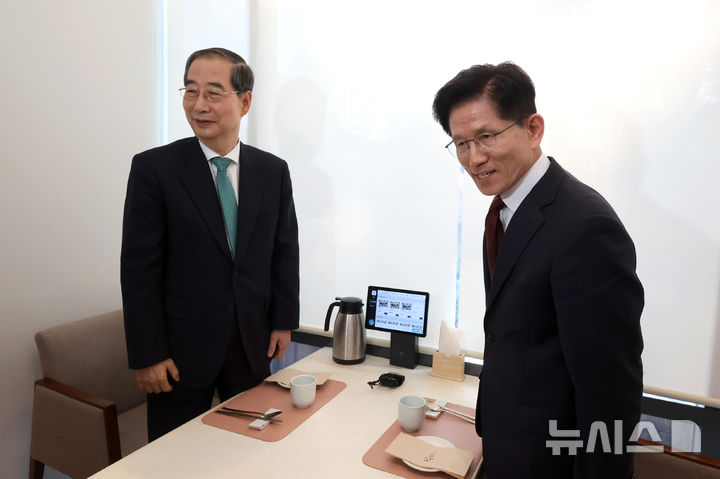 [서울=뉴시스] 고승민 기자 = 김문수 국민의힘 대선 후보와 한덕수 무소속 대선 후보가 7일 서울 종로구의 한 식당에서 단일화 관련 회동을 하고 있다. (공동취재) 2025.05.07. [email protected]