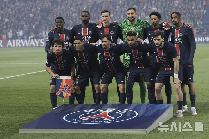 [파리=AP/뉴시스] 파리 생제르맹(PSG) 선수들이 7일(현지 시간) 프랑스 파리의 파르크 데 프랭스에서 열리는 2024-25 유럽축구연맹(UEFA) 챔피언스리그(UCL) 4강 2차전 아스널(영국)과의 경기에 앞서 기념 촬영하고 있다. 이강인이 결장한 PSG가 2-1로 이겨 1,2차전 합계 5-1로 승리하고 UCL 결승에 진출했다. 2025.05.08.