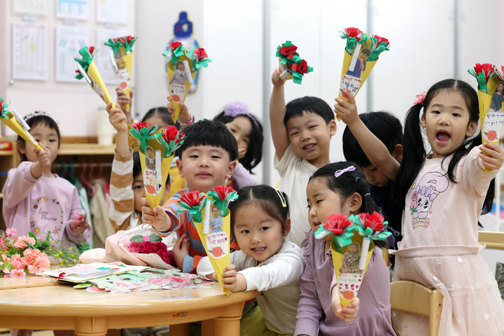 [광주=뉴시스] 박기웅 기자 = 어버이날인 8일 오전 광주 북구청어린이집에서 아이들이 부모님께 드릴 카네이션을 만들고 있다. (사진 = 광주 북구 제공) 2025.05.08. [email protected]