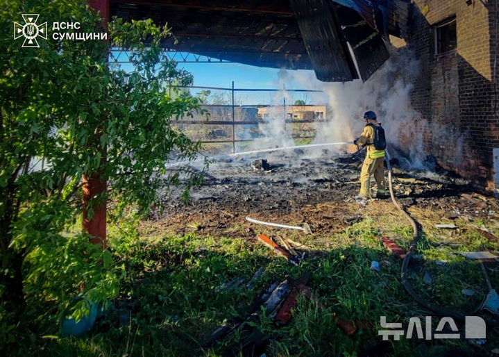 [수미=AP/뉴시스] 8일(현지 시간) 우크라이나 수미에서 한 소방관이 러시아 공습으로 크게 파손된 건물의 화재를 진압하고 있다. 이 사진은 우크라이나 비상사태부가 제공했다. 2025.05.08.