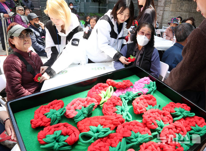 [부산=뉴시스] 하경민 기자 = 어버이날인 8일 부산 사상구 백양복지관에서 동서대 총학생회 학생들이 어르신들에게 양말목으로 만든 카네이션을 달아주고 있다. 2025.05.08. [email protected]
