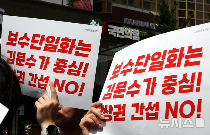 [서울=뉴시스] 고승민 기자 = 8일 서울 여의도 국민의힘 당사 앞에서 김문수 대선 후보 지지자들이 피켓을 들고 김 후보 중심 단일화를 촉구하는 시위를 하고 있다. 2025.05.08. [email protected]