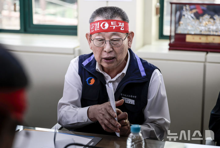 [서울=뉴시스] 정병혁 기자 = 박점곤 전국자동차노동조합연맹 서울시버스노동조합 위원장이 8일 서울 서초구 전국자동차노동조합연맹에서 열린 전국자동차노동조합연맹 대표자 회의에서 발언하고 있다. 2025.05.08. [email protected]