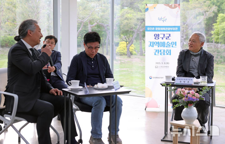 [서울=뉴시스] 조수정 기자 = 유인촌 문화체육관광부 장관이 8일 강원도 양구군 박수근 미술관에서 지역 예술인들을 만나 간담회를 갖고 있다. (사진=문화체육관광부 제공) 2025.05.08. [email protected]