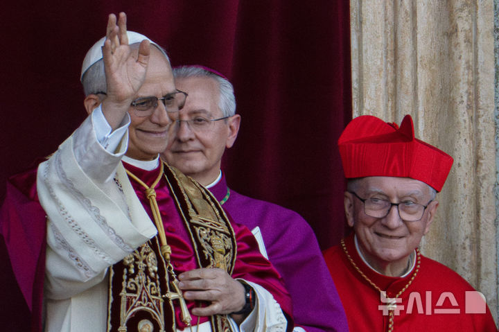 [바티칸=AP/뉴시스] 8일(현지 시간) 제267대 교황으로 선출된 미국의 로버트 프랜시스 프레보스트(69) 추기경이 선출 직후 바티칸 성베드로 대성당 중앙 '강복의 발코니'에서 인사하고 있다. 새 교황의 즉위명은 '레오 14세'로 '레오'는 라틴어로 '사자'를 뜻한다. 2025.05.09.