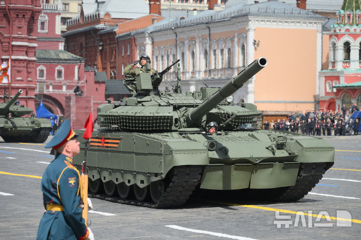 [모스크바=AP/뉴시스] 러시아의 T-80 BVM 전차들이 9일(현지 시간) 러시아 모스크바 붉은광장에서 열린 제2차 세계대전 승리 80주년(전승절) 기념 열병식에서 행진하고 있다. 2025.05.09.