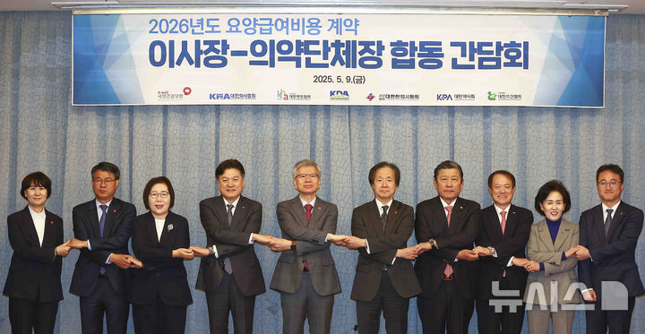[서울=뉴시스] 김근수 기자 = 정기석(왼쪽 여섯번째) 국민건강보험공단 이사장과 김택우(왼쪽 다섯번째) 대한의사협회장 등 참석자들이 9일 서울 마포구 가든호텔에서 열린 2025학년도 요양급여비용 계약 이사장-의약단체장 합동 간담회에 앞서 기념촬영을 하고 있다. 2025.05.09. [email protected]