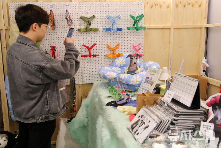 [서울=뉴시스] 김혜진 기자 = 9일 서울 성동구 이큐엘 그로브에서 열린 더현대 펫페어에서 한 방문객이 유명 강아지 인플루언서 킹받는 김율(킹율)을 찍고 있다.