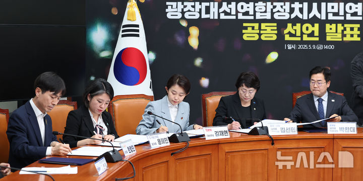 [서울=뉴시스] 권창회 기자 = 9일 서울 여의도 국회에서 열린 광장대선연합정치시민연대-제정당 연석회의 공동선언 발표 기자회견에서 정당 대표들이 선언문 조인식을 하고 있다. 사진 왼쪽부터 한창민 사회민주당 대표, 용혜인 기본소득당 대표, 김재연 진보당 상임대표, 김선민 조국혁신당 대표 권한대행, 박찬대 더불어민주당 당대표 직무대행 겸 원내대표. 2025.05.09. [email protected]