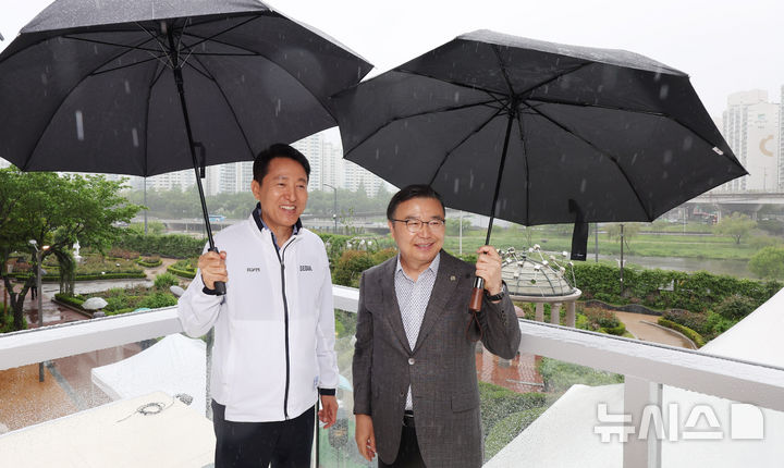 [서울=뉴시스] 조수정 기자 = 오세훈 서울시장, 류경기 중랑구청장이 9일 서울 중랑구 중랑장미공원에서 열린 묵동천 수변활력거점 조성사업 '중랑장미카페' 준공식을 마친 뒤 사업지를 둘러보고 있다. 2025.05.09. [email protected]