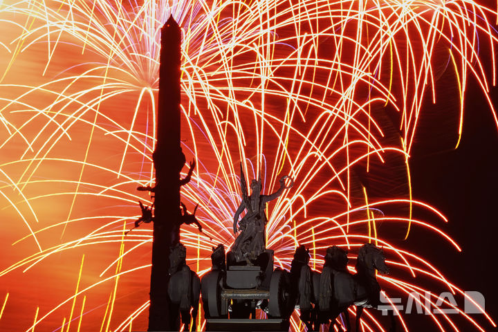 [모스크바=AP/뉴시스] 9일(현지 시간) 러시아 모스크바 포클론나야 고라(경배의 언덕)에 있는 개선문 꼭대기의 사두마차상(콰드리가) 위로 전승절 80주년 축하 불꽃놀이가 펼쳐지고 있다. 2025.05.10.