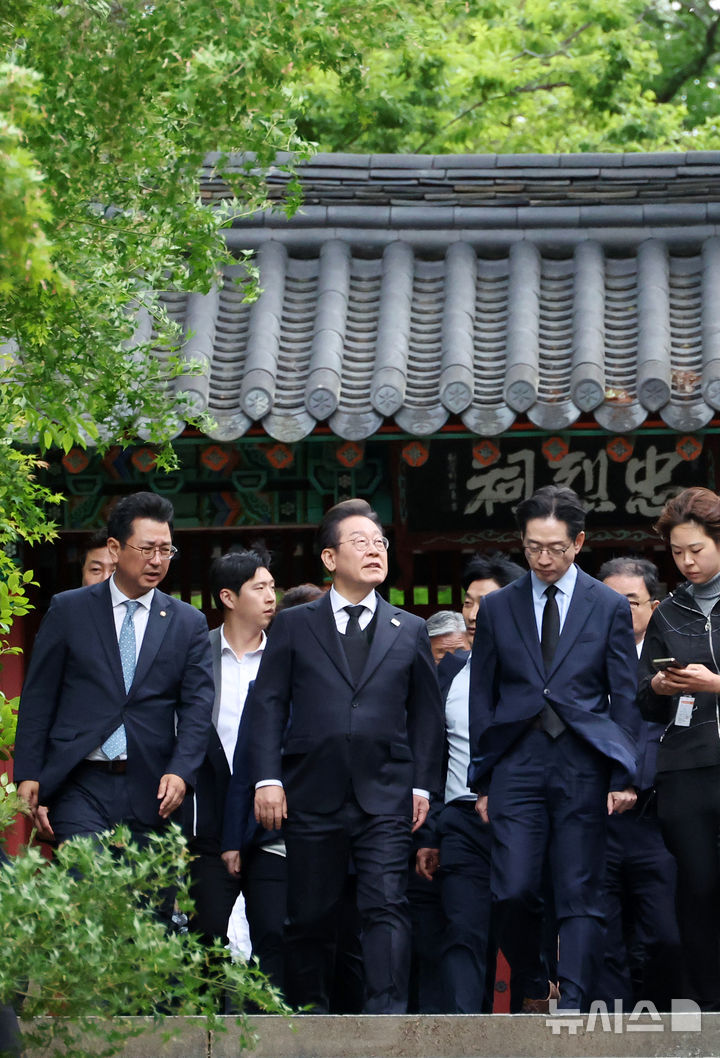 [남해=뉴시스] 조성우 기자 = 민심을 청취하는 '경청 투어'에 나선 이재명 더불어민주당 대선후보가 10일 경남 남해군 충렬사 이순신 장군 사당을 참배한 뒤 이동하고 있다. 2025.05.10. [email protected]