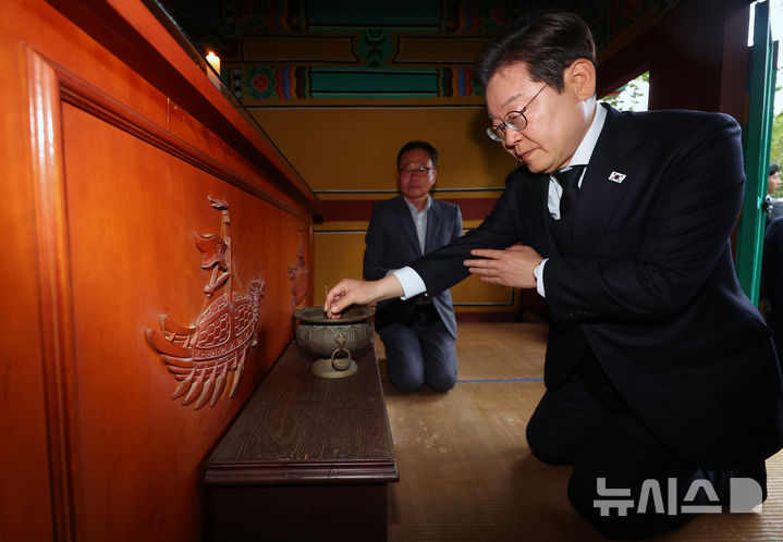 [남해=뉴시스] 조성우 기자 = 민심을 청취하는 '경청 투어'에 나선 이재명 더불어민주당 대선후보가 10일 경남 남해군 충렬사 이순신 장군 사당을 참배하고 있다. (공동취재) 2025.05.10. [email protected]