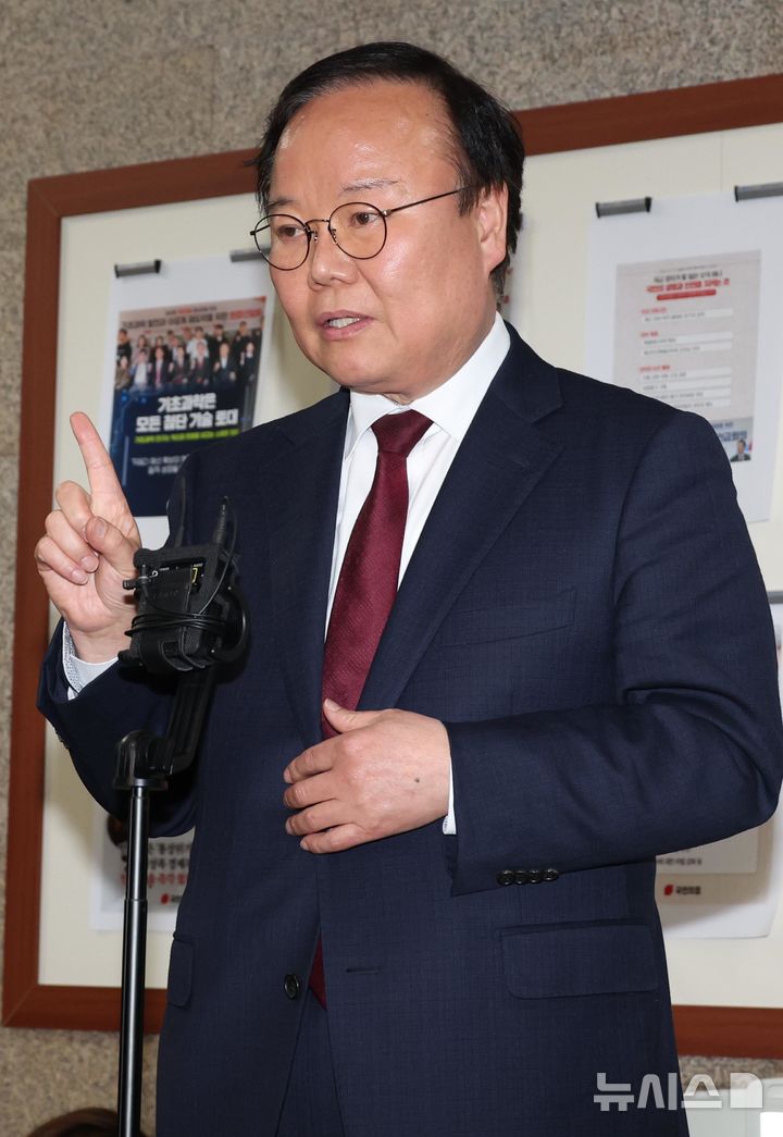 [서울=뉴시스] 조성봉 기자 = 김문수 국민의힘 대선후보 측 김재원 비서실장이 10일 오후 서울 여의도 국회에서 '김문수-한덕수 대선후보 측 단일화 협상'을 마치고 취재진의 질문에 답변하고 있다. 2025.05.10. [email protected]