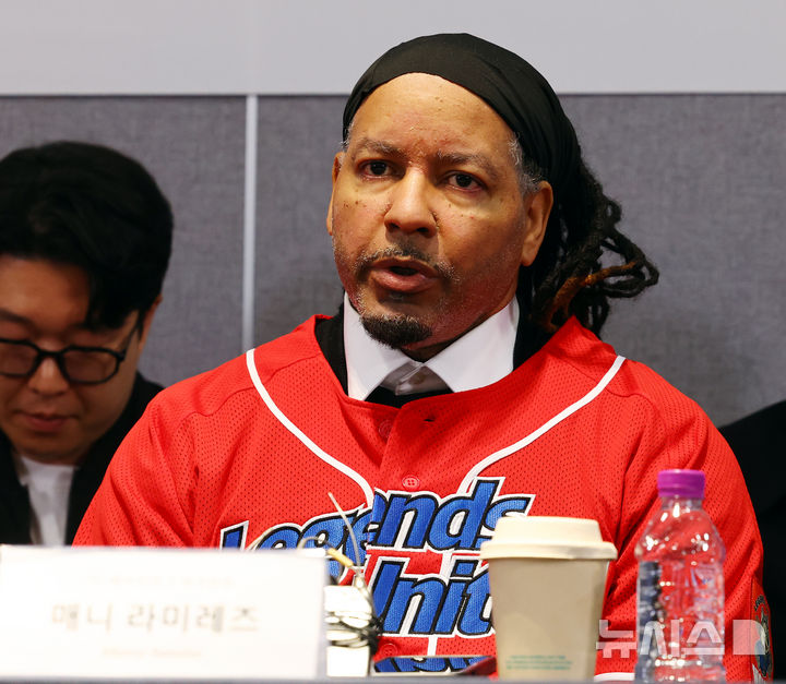 [서울=뉴시스] 박주성 기자 = 메이저리그 '레전드' 매니 라미레즈가 11일 오전 서울 고척 스카이돔 다이아몬드룸에서 2025 레전드 매치 관련 기자회견에서 취재진 질문에 답하고 있다. 2025.05.11. [email protected]
