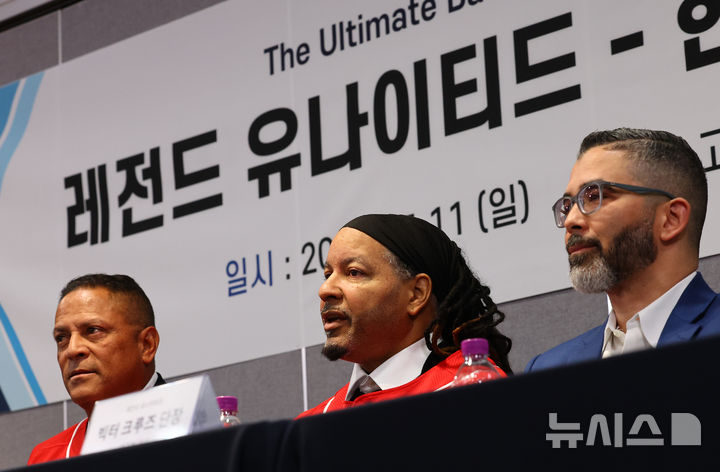 [서울=뉴시스] 박주성 기자 = 메이저리그 '레전드' 매니 라미레즈가 11일 오전 서울 고척 스카이돔 다이아몬드룸에서 2025 레전드 매치 관련 기자회견에서 취재진 질문에 답하고 있다. 2025.05.11. [email protected]