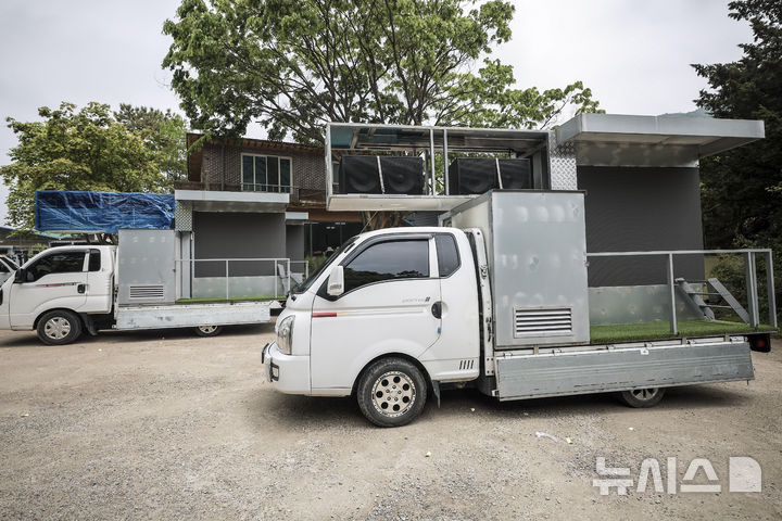 [양주=뉴시스] 정병혁 기자 = 21대 대선 공식 선거 운동을 하루 앞둔 11일 경기 양주시의 국민의힘 대통령 선거 유세차량 제작을 맡은 업체에 국민의힘 선거 유세에 투입될 차량이 미완성인 채로 세워져있다. 국민의힘은 전날 대선 후보 교체를 두고 갈등을 빚다 전 당원투표를 통해 김문수 후보를 대선 후보로 확정했다. 2025.05.11. [email protected]