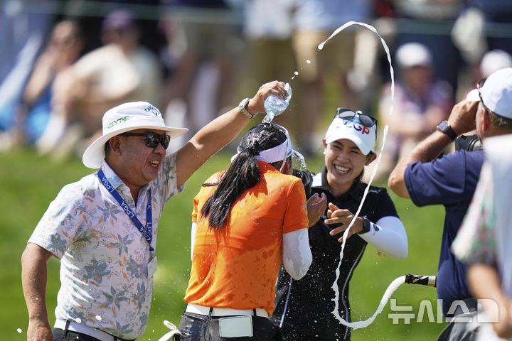 [저지시티=AP/뉴시스] 지노 티띠꾼(태국)이 11일(현지 시간) 미 뉴저지주 저지시티 리버티 내셔널GC에서 열린 미국여자프로골프(LPGA) 투어 미즈호 아메리카 오픈 정상에 올라 축하 세례를 받고 있다. 티띠꾼은 최종 합계 17언더파 274타로 우승하며 투어 5승째를 올렸다. 2025.05.12.