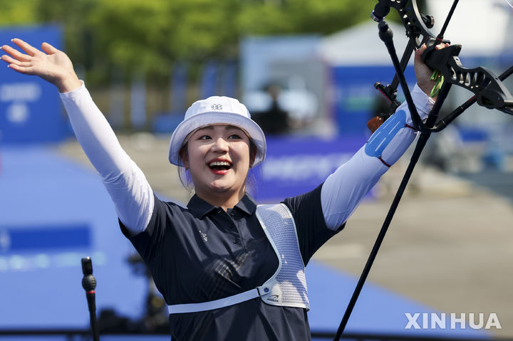 [상하이=신화/뉴시스] 이가현이 11일(현지 시간) 중국 상하이에서 열린 2025 양궁 현대 월드컵 2차 대회 리커브 여자 개인전 결승에서 승리 후 환호하고 있다. 이가현은 임시현을 6-2(28-29 29-28 29-28 29-27)로 꺾고 생애 처음으로 월드컵 개인전 금메달을 목에 걸었다. 2025.05.12.