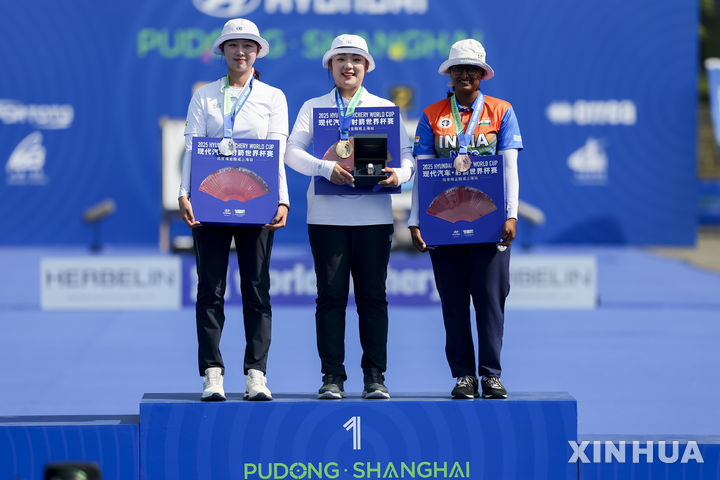 [상하이=신화/뉴시스] 이가현(가운데)과 임시현(왼쪽)이 11일(현지 시간) 중국 상하이에서 열린 2025 양궁 현대 월드컵 2차 대회 리커브 여자 개인전1,2위를 차지해 각각 금·은메달을 목에 걸고 기념 촬영하고 있다. 이가현은 결승에서 임시현을 6-2(28-29 29-28 29-28 29-27)로 꺾고 생애 처음으로 월드컵 개인전 금메달을 목에 걸었다. 2025.05.12.