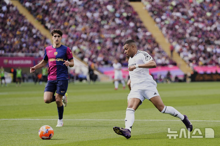 [바르셀로나=AP/뉴시스] 레알 마드리드의 킬리안 음바페가 11일(현지 시간) 스페인 바르셀로나의 에스타디 올림피크 유이스 쿰파니스에서 열린 2024-25 라리가 35라운드 FC 바르셀로나와의 경기 중 공을 다루고 있다. 음바페는 해트 트릭으로 활약했으나 레알은 전반에만 4실점하면서 3-4로 패했다. 2025.05.12.