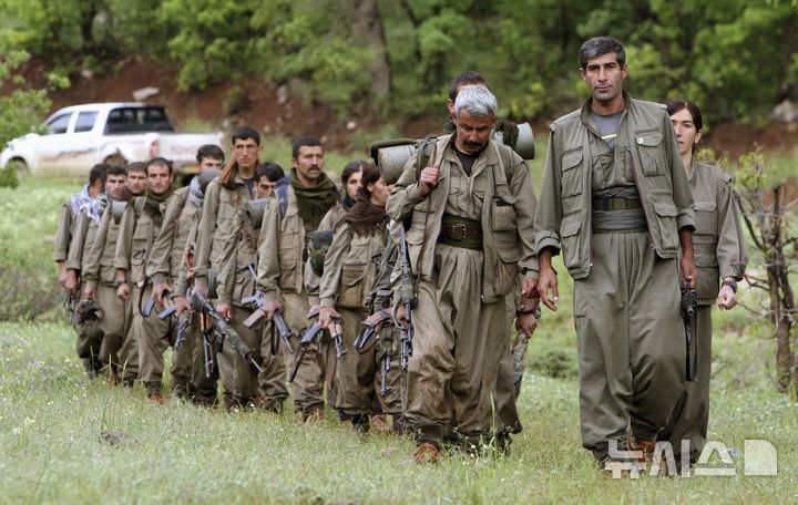 [헤로르(이라크)=AP/뉴시스]2013년 5월14일 이라크 바그다드에서 북서쪽으로 430㎞ 떨어진 다후크 북동쪽 헤로르 지역에 쿠르드노동자당(PKK) 소속 무장 쿠르드족 전사들이 진입하고 있다. PKK는 12일 튀르키예와의 새로운 평화 이니셔티브의 일환으로 무장단체를 해체하고 무장을 해제알 것이라고 발표, 40년 간의 무력 충돌을 종식시킬 것이라고 발표했다. 2025.05.12.