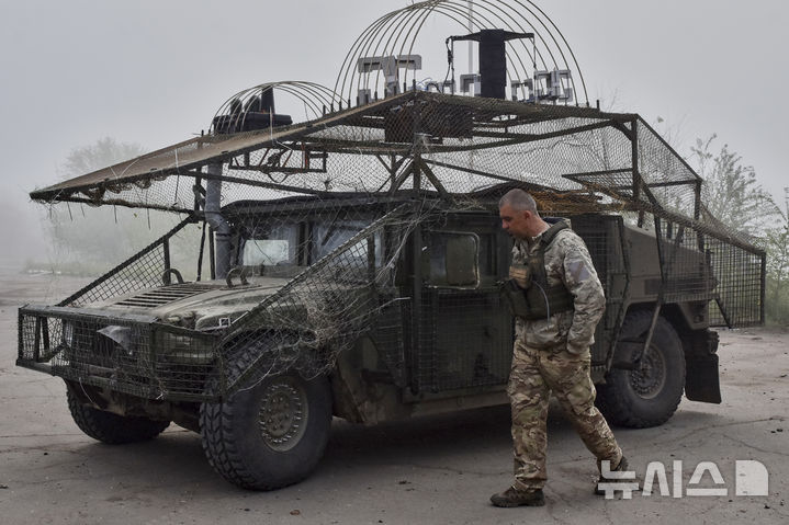 [자포리자(우크라이나)=AP/뉴시스]우크라이나 자포리자의 최전선 지역에서 지난 5일 우크라이나군 65기계회여단 소속 병사 1명이 반(反)드론 장비가 설치된 차량 옆을 지나가고 있다. 러시아가 30일 간의 무조건 휴전을 거부한 후 우크라이나를 향해 샤헤드 드론과 미끼용 드론 100대 이상을 발사했다고 우크라이나 공군이 12일 밝혔다. 2025.05.12.