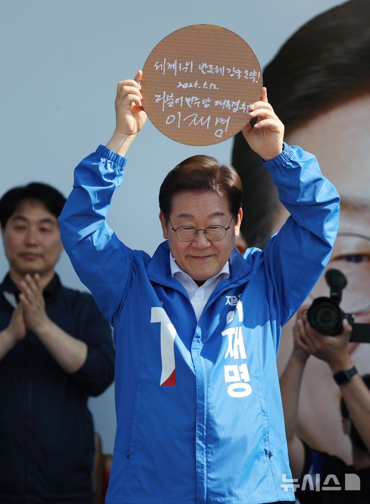 [화성=뉴시스] 조성우 기자 =이재명 더불어민주당 대선후보가 제21대 대통령선거 공식 선거운동이 시작된 12일 경기 화성시 동탄 센트럴파크 음악분수중앙광장에서 열린 집중유세에서 '세계1위 반도체 강국도약'이라고 쓴 반도체 웨이퍼를 들어보이고 있다. 2025.05.12. [email protected]