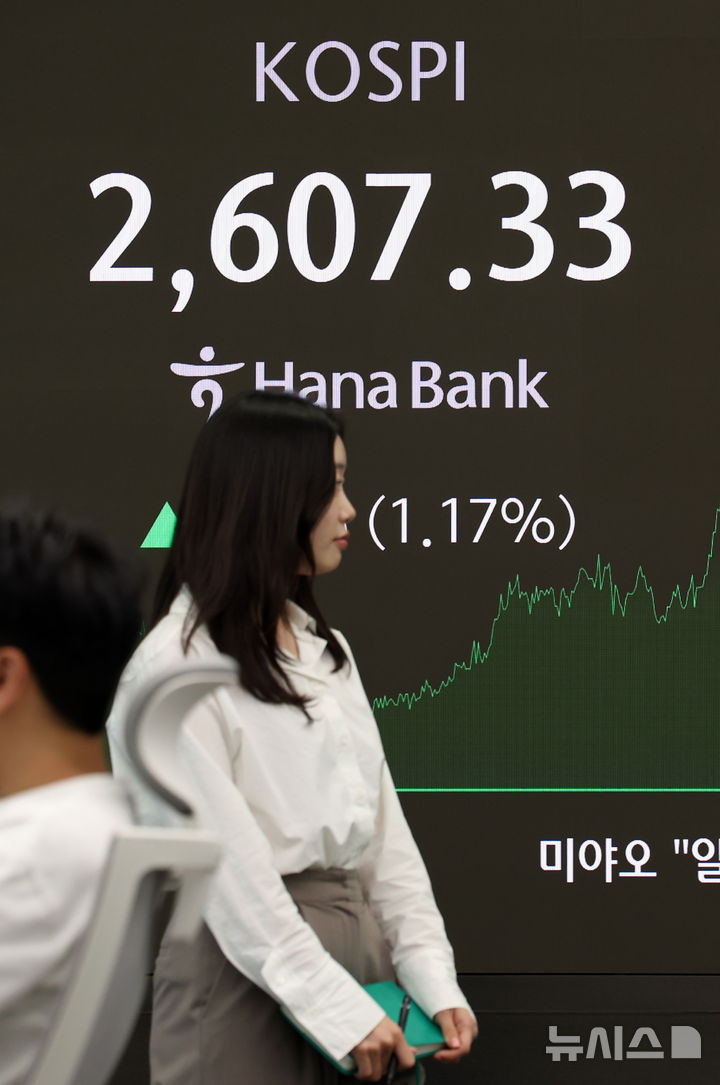 [서울=뉴시스] 이영환 기자 = 코스피가 전 거래일(2577.27)보다 30.06포인트(1.17%) 상승한 2607.33에 마감한 12일 오후 서울 중구 하나은행 딜링룸 전광판에 지수가 표시되고 있다.