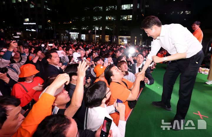 [서울=뉴시스] 조성봉 기자= 이준석 개혁신당 대선후보가 12일 오후 서울 중구 청계광장에서 열린 집중유세를 마치고 시민들과 악수를 하고 있다. 2025.05.12. [email protected]