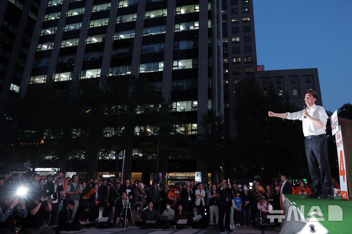 [서울=뉴시스] 조성봉 기자 = 이준석 개혁신당 대선후보가 12일 서울 중구 청계광장에서 열린 집중유세에서 지지를 호소하고 있다. (공동취재) 2025.05.12. [email protected]