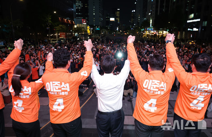 [서울=뉴시스] 조성봉 기자 = 이준석 개혁신당 대선후보가 12일 서울 중구 청계광장에서 열린 집중유세에서 지지를 호소하고 있다. (공동취재) 2025.05.12. [email protected]