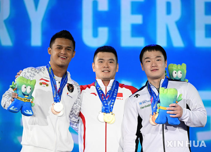 [장산=신화/뉴시스] 손현호(오른쪽)가 12일(현지 시간) 중국 저장성 장산에서 열린 2025 아시아역도선수권대회 남자 81㎏급 합계 시상대에 올라 동메달을 걸고 포즈를 취하고 있다. 손현호는 인상 157㎏, 용상 200㎏, 합계 357㎏을 들어 올려 합계 3위(인상 3위, 용상 1위)로 동메달을 목에 걸었다. 아시아역도선수권대회는 인상, 용상, 합계 세 부문에서 각각 메달이 수여돼 손현호는 금메달과 동메달 2개를 따냈다.  2025.05.13.