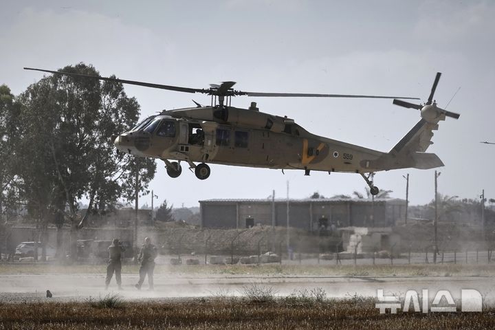 [레임=AP/뉴시스] 12일(현지 시간) 팔레스타인 무장 정파 하마스로부터 석방될 예정인 미국·이스라엘 이중국적 병사 에단 알렉산더를 맞이하기 위해 그의 가족이 군용 헬기를 타고 이스라엘 남부 레임의 군 기지에 도착하고 있다. 알렉산더는 뉴저지 출신으로, 가자지구에 억류돼 있던 마지막 미국인 생존자로 알려졌다. 2025.05.13.