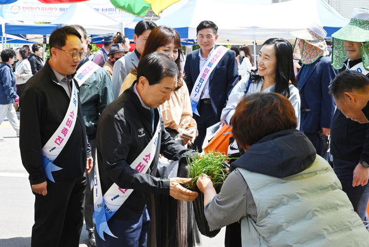[창녕=뉴시스] 성낙인 경남 창녕군수가 12일 군 관계자들과 함께 남지시장을 방문해 지역 농산물과 생필품을 구입하며 전통시장 장보기 캠페인에 참여하고 있다. (사진= 창녕군 제공) 2025.05.13. [email protected]