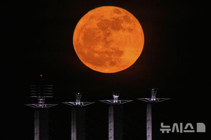 [캔자스시티=AP/뉴시스] 12일(현지 시간) 미 미주리주 캔자스시티 컨벤션 센터 옥상 조형물 뒤로 보름달이 떠오르고 있다. 2025.05.13.