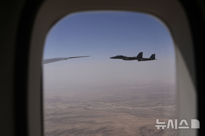 [리야드=AP/뉴시스] 13일(현지 시간) 도널드 트럼프 미국 대통령을 태운 전용기 에어포스원이 사우디에 도착하는 가운데, 사우디 공군의 F-15 전투기들이 이를 호위하고 있다. 2025.05.13.