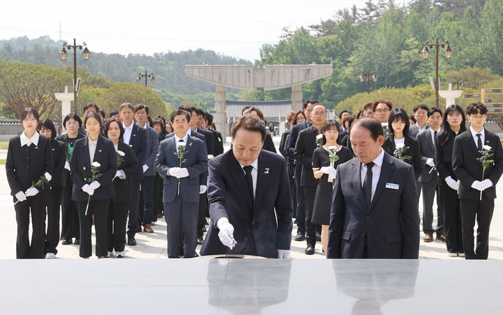 [광주=뉴시스] 박기웅 기자 = 13일 오전 임택 광주 동구청장과 동구 간부급 직원들이 제45주년 5·18민주화운동 기념일을 앞두고 국립5·18민주묘지를 찾아 헌화·참배하고 있다. (사진=광주 동구 제공) 2025.05.13. [email protected]