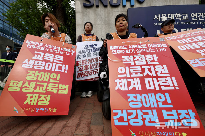 [서울=뉴시스] 김명년 기자 = 전국장애인차별철폐연대 회원들이 13일 오전 서울 종로구 서울대학교병원 후문 앞에서 장애인 의무 고용률 준수 촉구 기자회견을 열고 있다. 2025.05.13. [email protected]