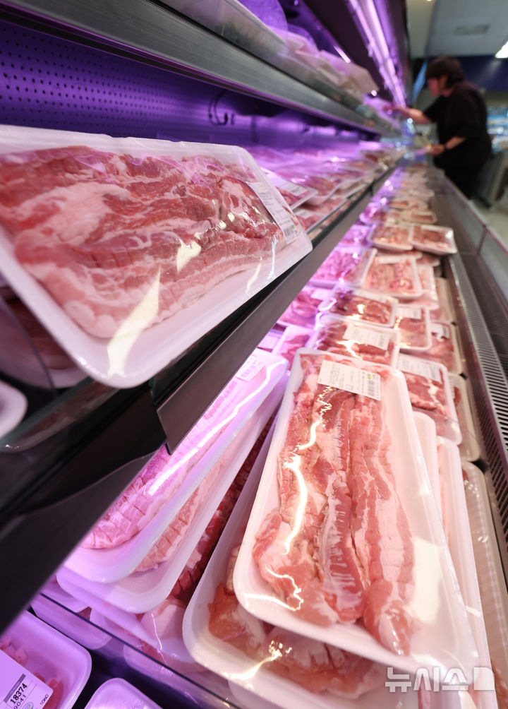 [서울=뉴시스] 김진아 기자 = 계란, 돼지고기 등 일부 축산물을 중심으로 한 먹거리 물가가 불안이 이어지고 있다. 지난달 하순 기준 국내산 냉장 삼겹살 평균 소비자가격은 100g당 2446원으로 전년 동기(2368원)대비 3.3% 상승했다. 목살도 같은 기간 2209원에서 2242원으로 1.5% 올랐다. 사진은 13일 서울 시내의 한 대형마트에 진열된 돼지고기. 2025.05.13. [email protected]